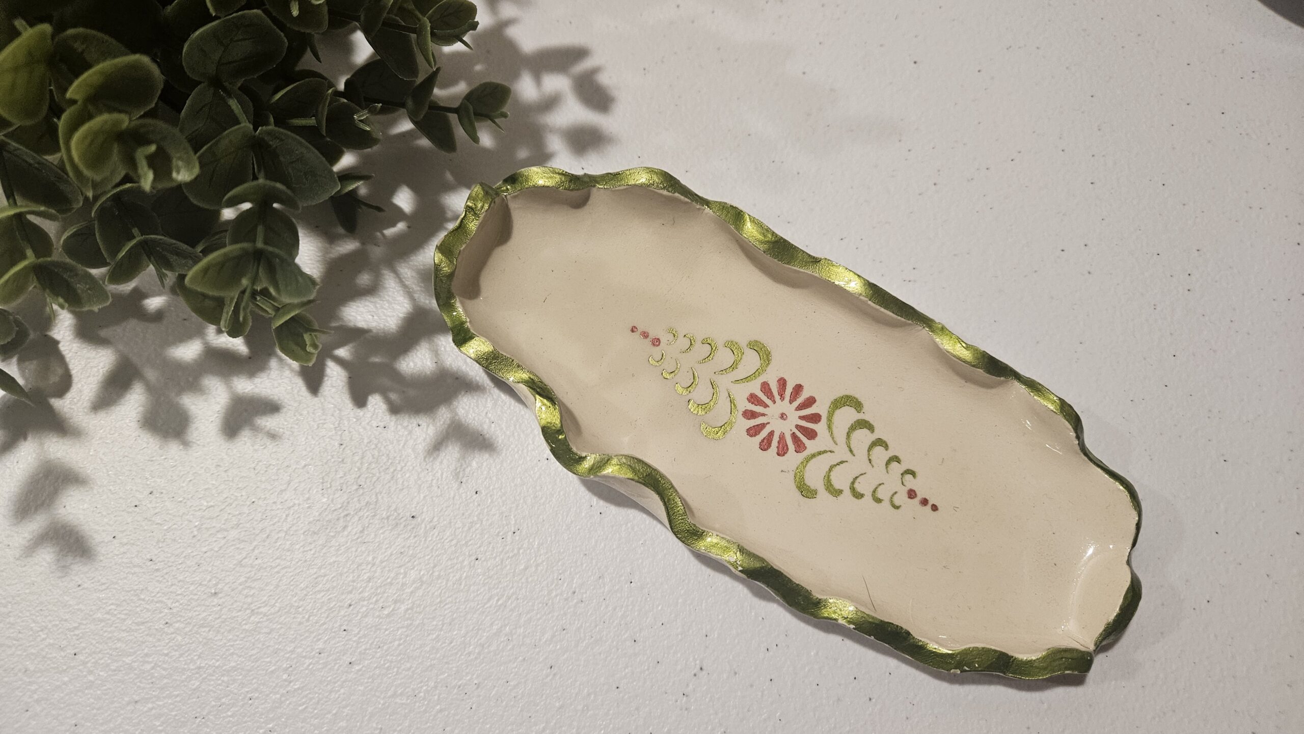 Oval curly edge with flower design and metalic green border trinket dish for decoration or to use for jewellery!
