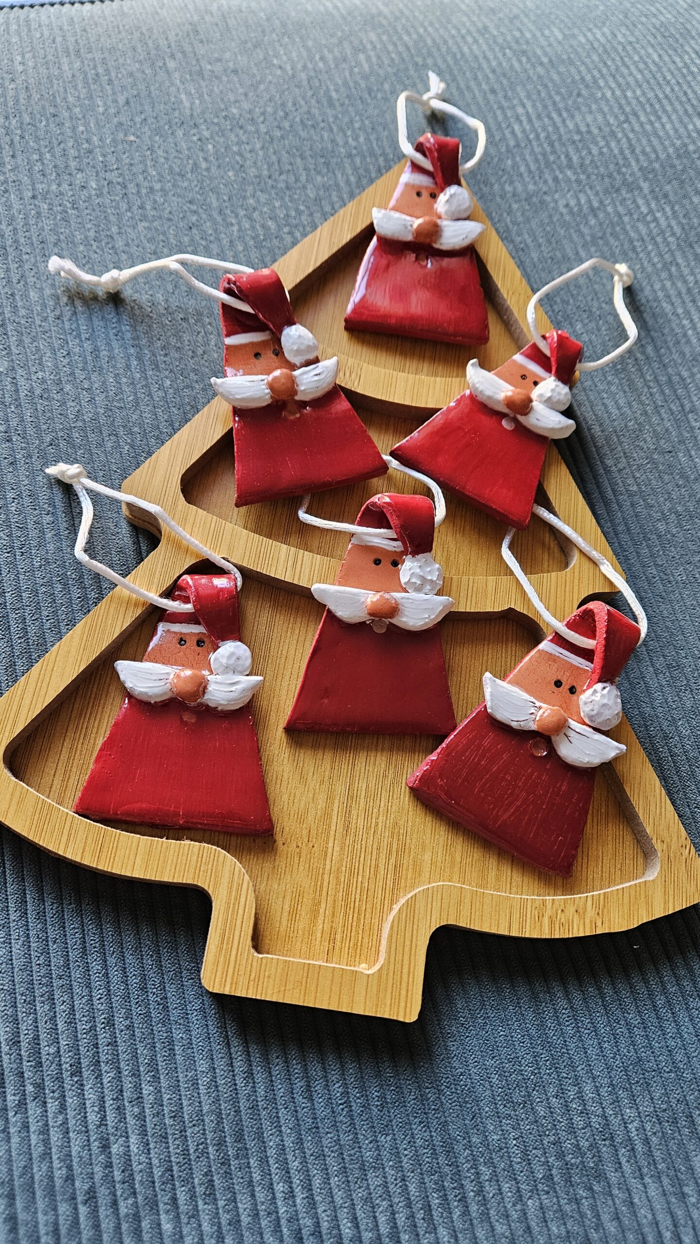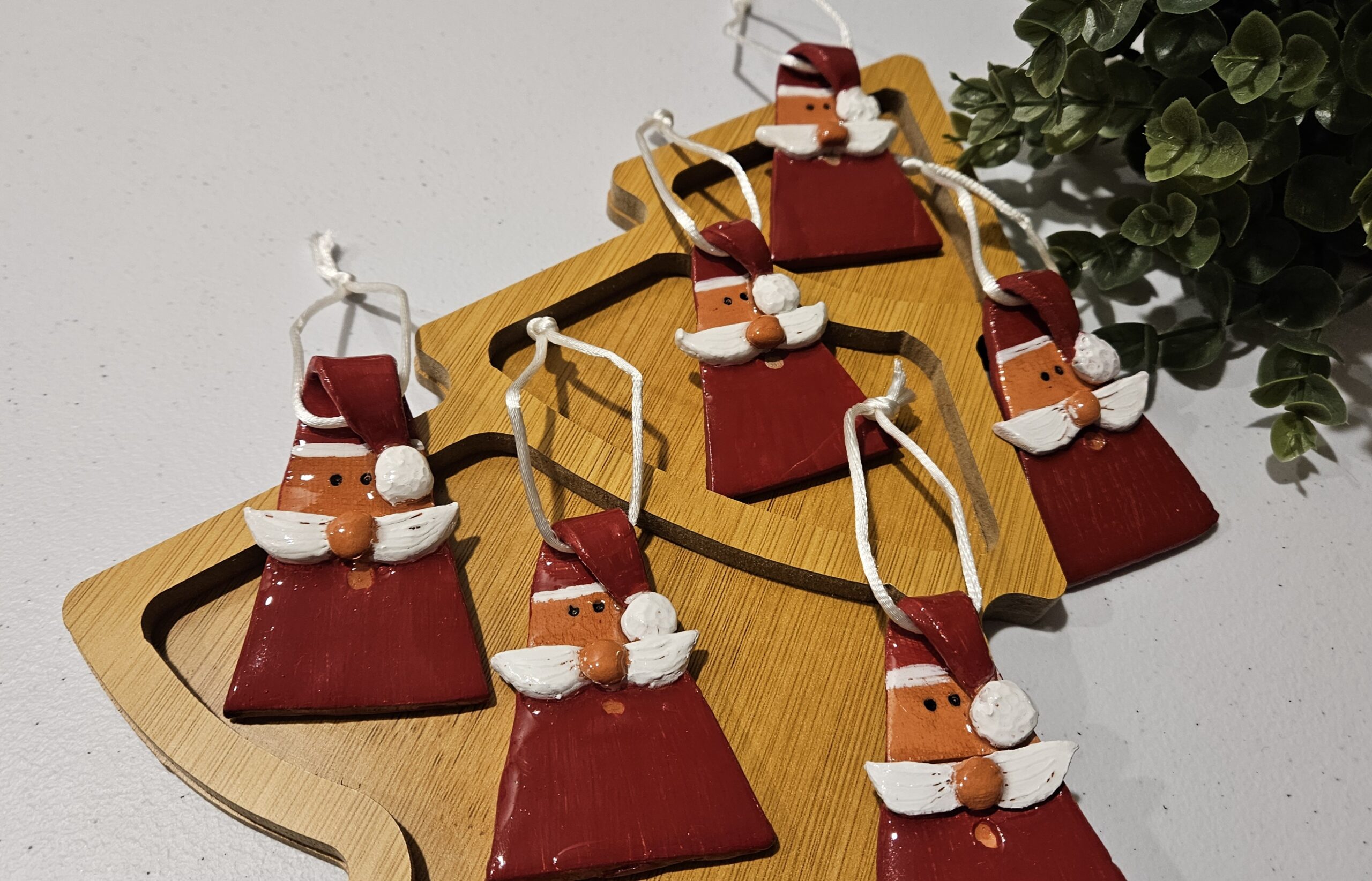 Santa triangle shape ornament with a shiny coat of resin.